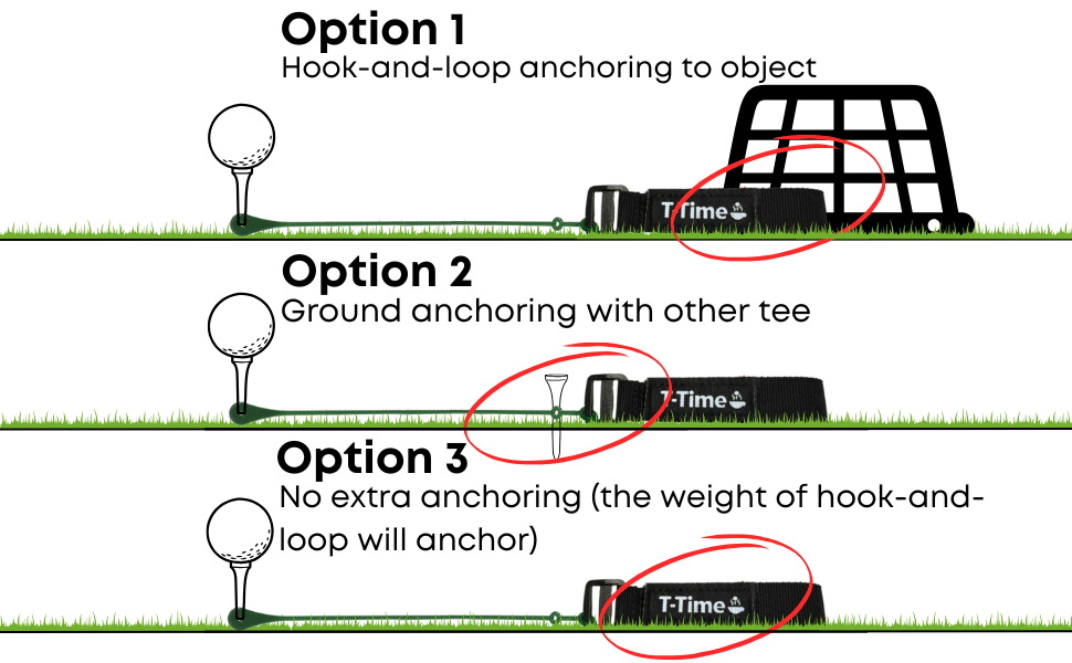 Fasten the other end to suitable object like driving basket, baggy stand foot or even water bottle using velcro strap or you can just attach it to the ground using tee.